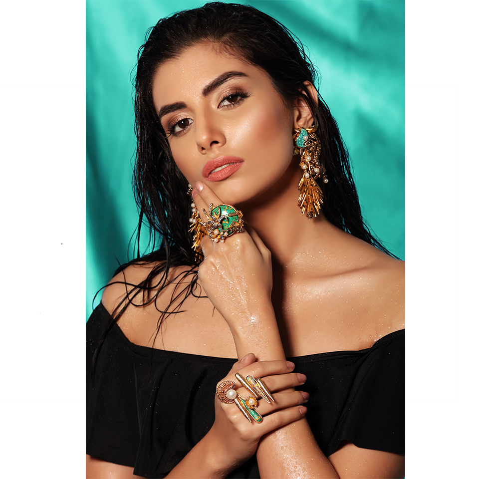 Earrings with gold-plating and rhodium touches, embellished with rough feroza stone and zircons.