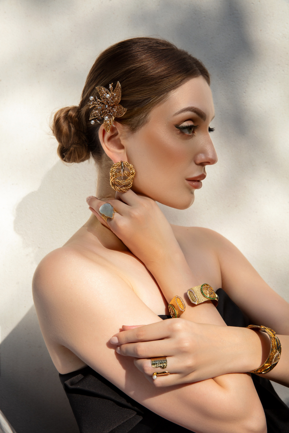 Refined gold-plated earrings featuring intricate metal wire rings for a sleek, modern touch.