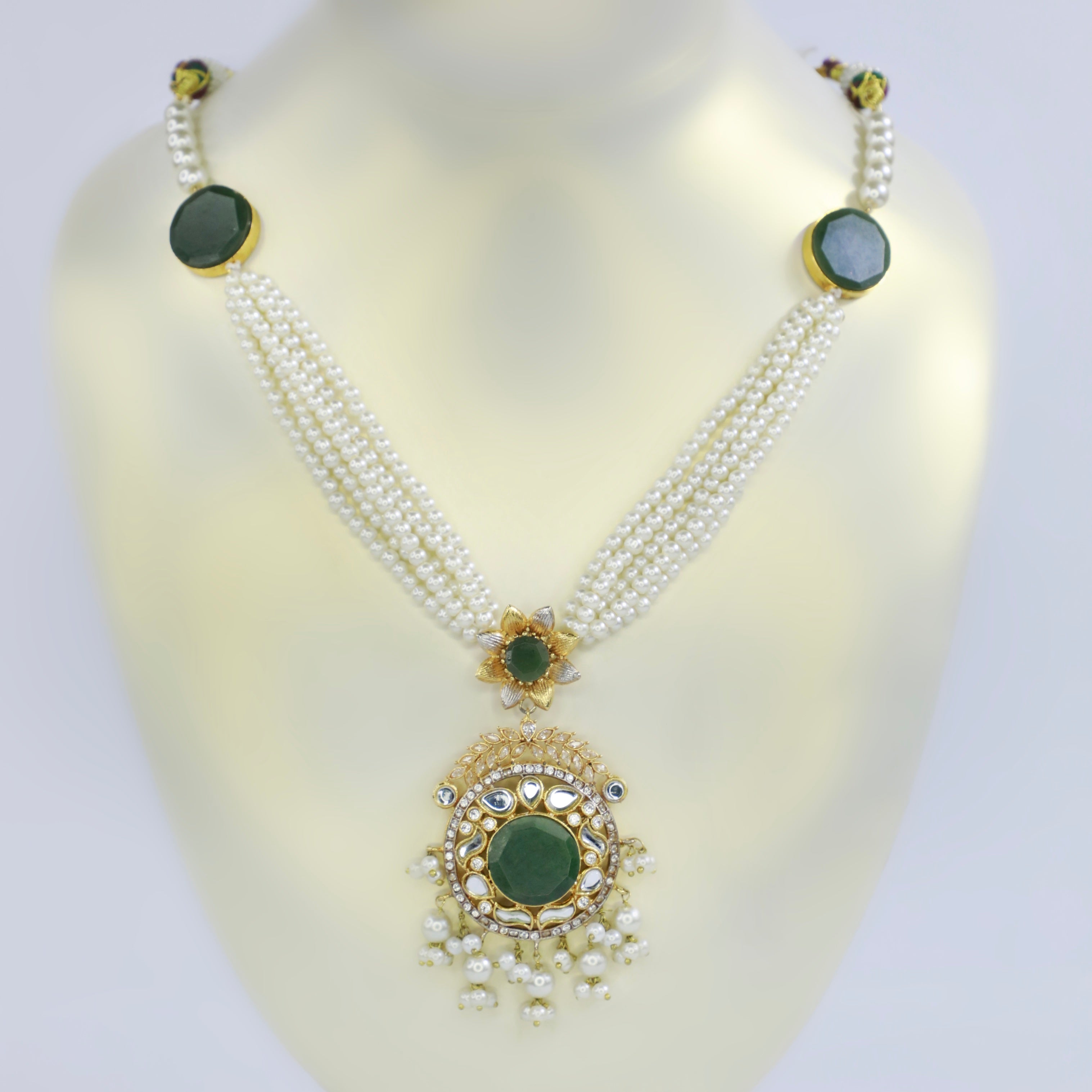 Gold-plated brass mala adorned with green jade, pearls, zircons and kundans.