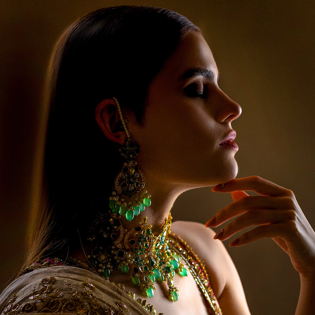 Exquisite gold-plated choker, embellished with emerald green stone, zircons and real Indian droplets