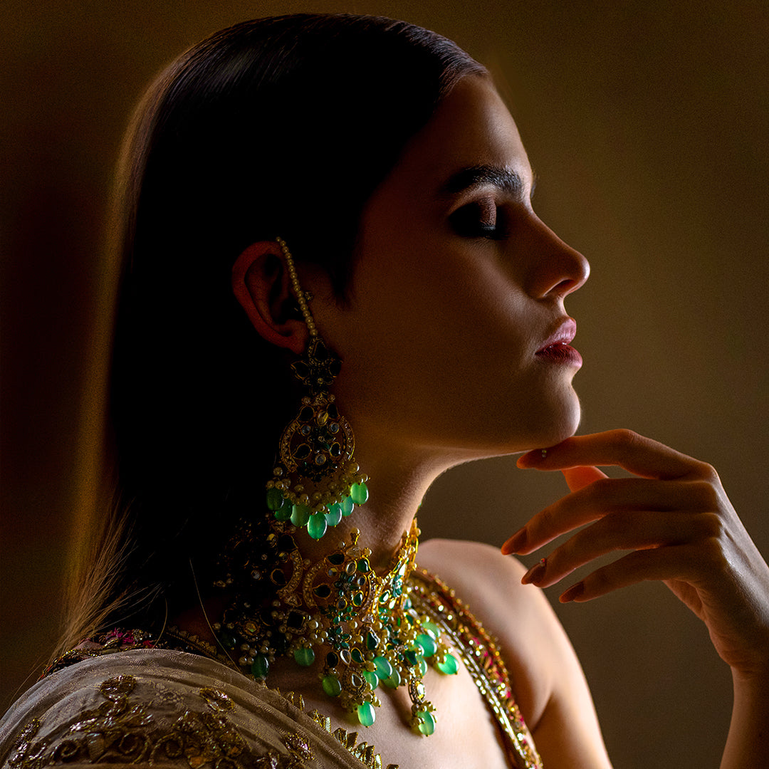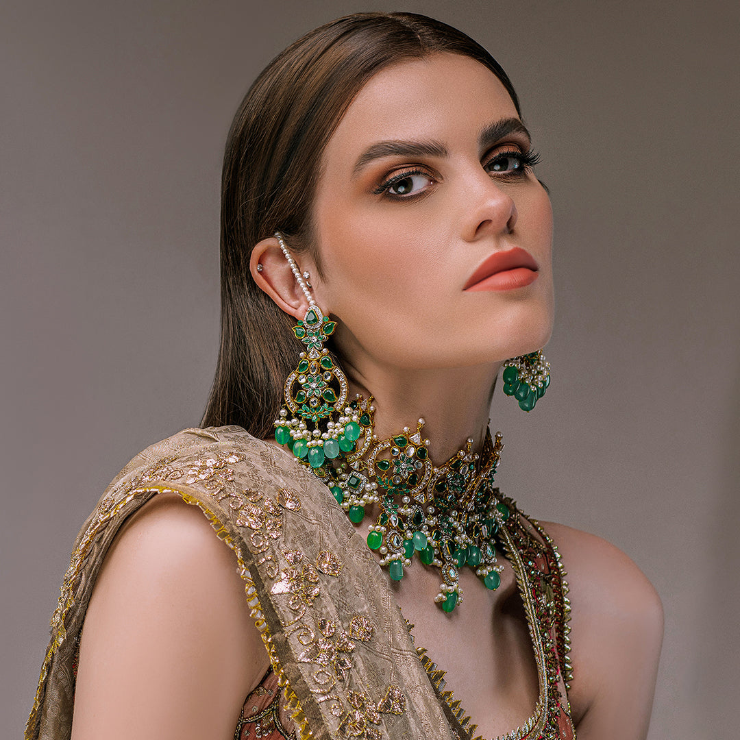 Exquisite gold-plated earrings, embellished with emerald green stone, zircons and real Indian droplets.