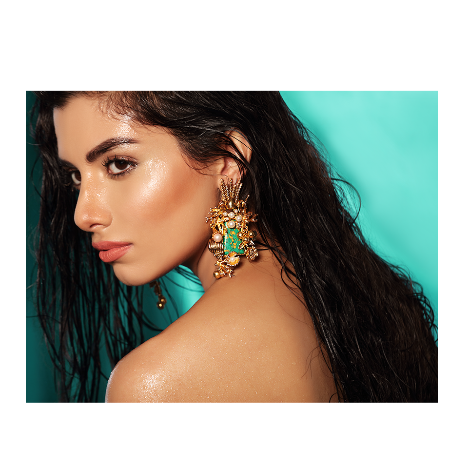 Gold-plated brass earrings with rhodium touches, designed with green real feroza.