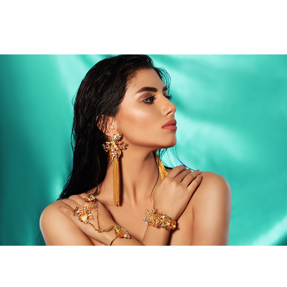 Gold-plated brass earrings, adorned with Indian chain, real pearls and zircons.
